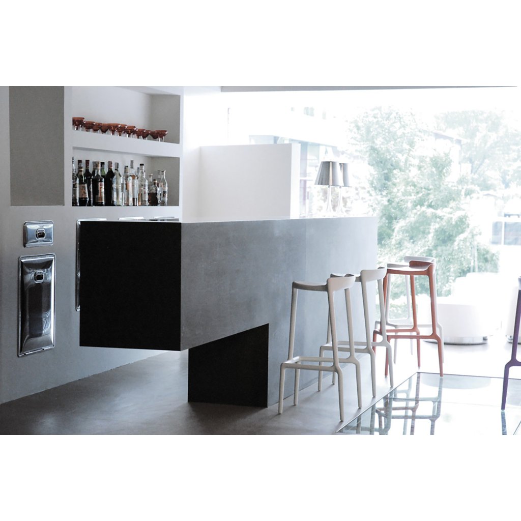 - barová stolička vyrobená z polypropylénu, vystužená sklenenými vláknami, je ľahká a zároveň odolná a stabilná