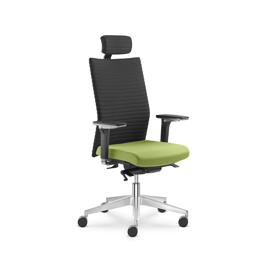 Otočná kancelárska stolička k počítaču, výškovo nastaviteľná, s vysokým čalúneným operadlom a opierkou hlavy, a synchrónnym mechanizmom SYS s bočným nastavením pre dokonalé pracovné pohodlie