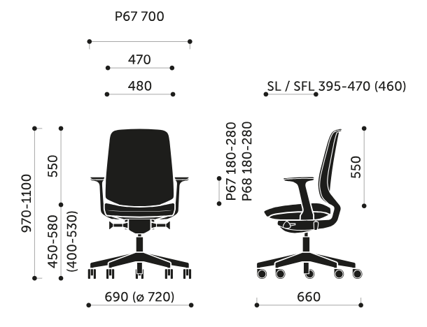 - základná verzia bez podrúčiek alebo možnosť výberu podrúčiek P67 TPU - výškovo nastaviteľné (rozpätie 100 mm), mäkká termo-polyuretánová (TPU) podložka pod lakťami (sivá farba).