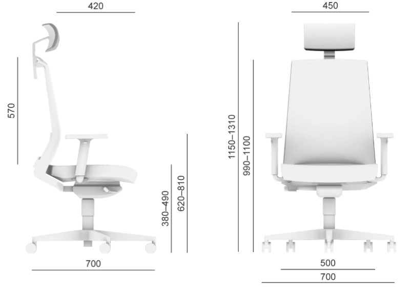 - rozmery stoličky (bez funkcie posuv sedadla): výška 1150-1310 mm x šírka 700 mm x hĺbka 700 mm, výška sedadla pozaťažení 380-490 mm, výška operadla 570 mm