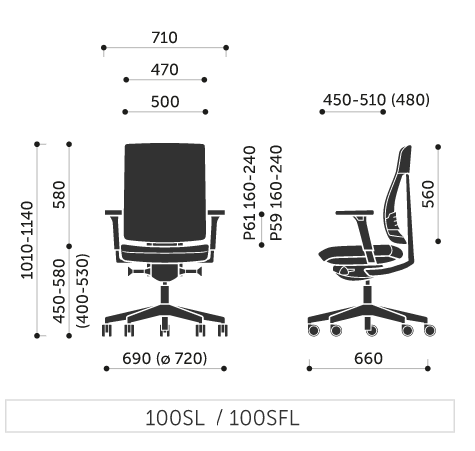 - rozmery 100SL / 100SFL - výška 1010-1140 mm x šírka 710 mm x hĺbka 720 mm, výška sedadla 450-580 mm, výška operadla 580 mm