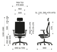 - celkový rozmer: výška 1190-1380 mm x šírka 710/800 mm x hĺbka 720 mm, výška sedu po zaťažení v rozpätí 395-525 mm