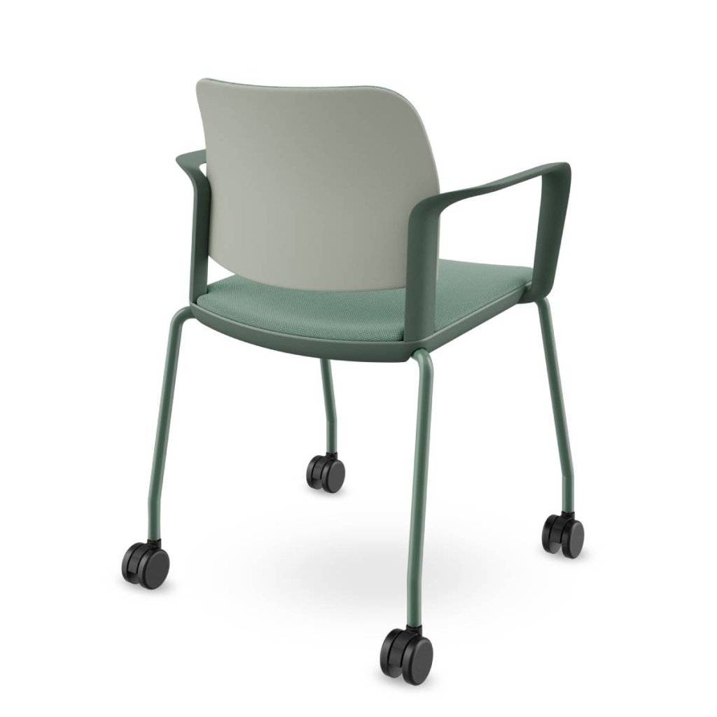 Stoličky stoja na štvornohej podnoži, ktorú ponúkame v štyroch farbách – čiernej, sivej, bronzovej a šalviovo zelenej. Na výber sú verzie s kolieskami alebo bez nich. Plastové korpusy sú dostupné v piatich atraktívnych odtieňoch – čiernej, hnedej, zelenej, šedo-bielej a šedo-modrej. Pre väčší komfort môžete zvoliť čistú plastovú verziu, model s čalúneným sedadlom alebo variant s čalúneným sedadlom aj operadlom. Funkčnosť zvyšujú praktické doplnky – podrúčky, sklopný stolík alebo spojovacie klipy na radenie stoličiek do radov. Všetky modely sú plne stohovateľné, čo umožňuje jednoduché skladovanie aj prevoz na praktickom prepravnom vozíku. Každý detail stoličiek bol navrhnutý tak, aby sa materiály využívali efektívne, s minimálnym odpadom, no bez kompromisov v odolnosti a pohodlí.