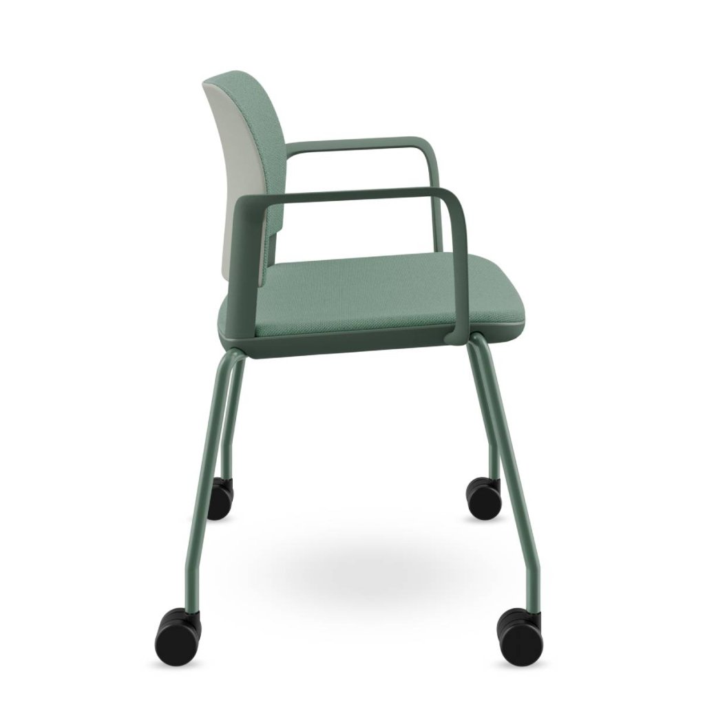 Konferenčná stolička so štvornohou oceľovou podnožou na kolieskach prináša vyšší komfort pri manipulácii a flexibilite sedenia. Vďaka kolieskam sa ľahko presúva po miestnosti a je vhodná najmä tam, kde je potrebné často meniť rozloženie sedenia alebo zabezpečiť mobilitu účastníkov - pri stretnutiach alebo workshope.