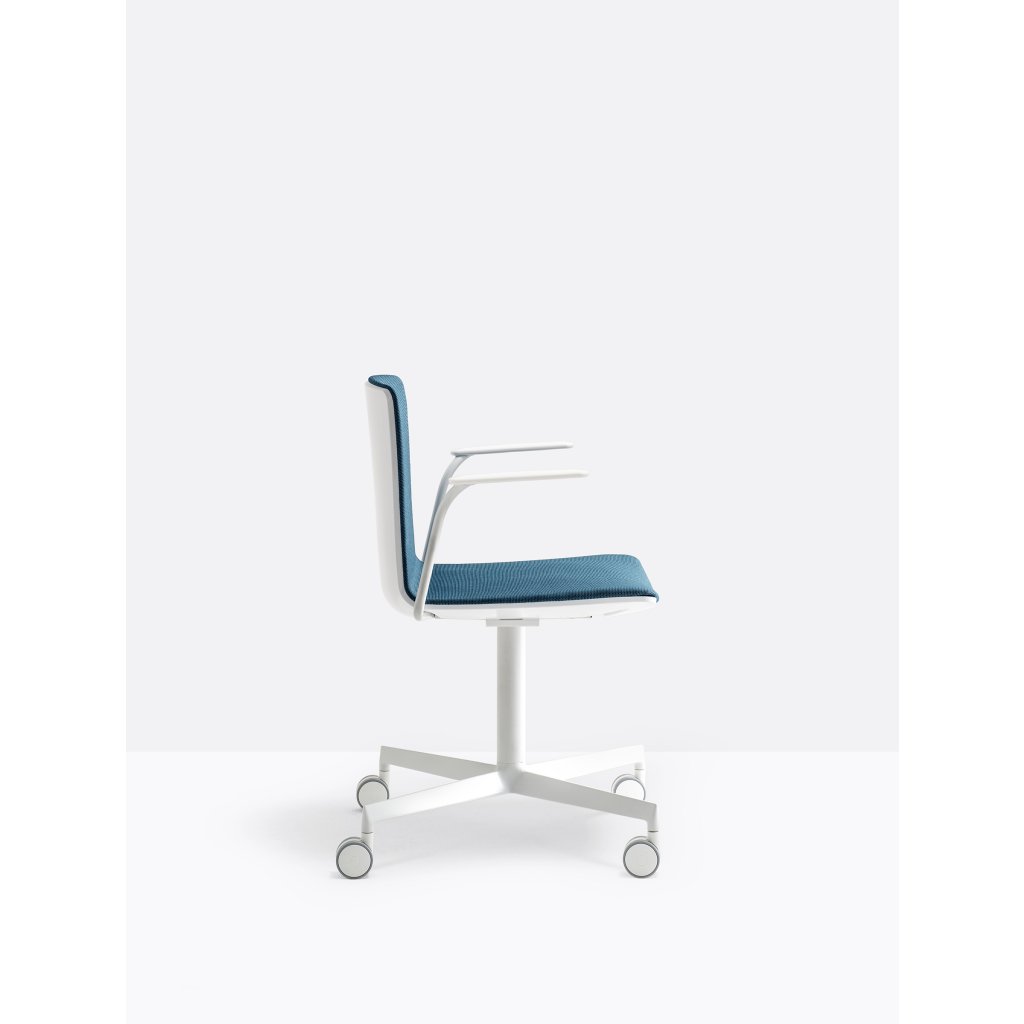 Kreslo NOA 728 má polykarbonátový korpus a lakťové opierky v čiernej alebo bielej farbe. Sedadlo a operadlo je z vnútornej (sedacej plochy) čalúnené tkaninou podľa vášho výberu. Podnož tvorí centrálna noha z liateho hliníka so 4-ramenným krížom s kolieskami.