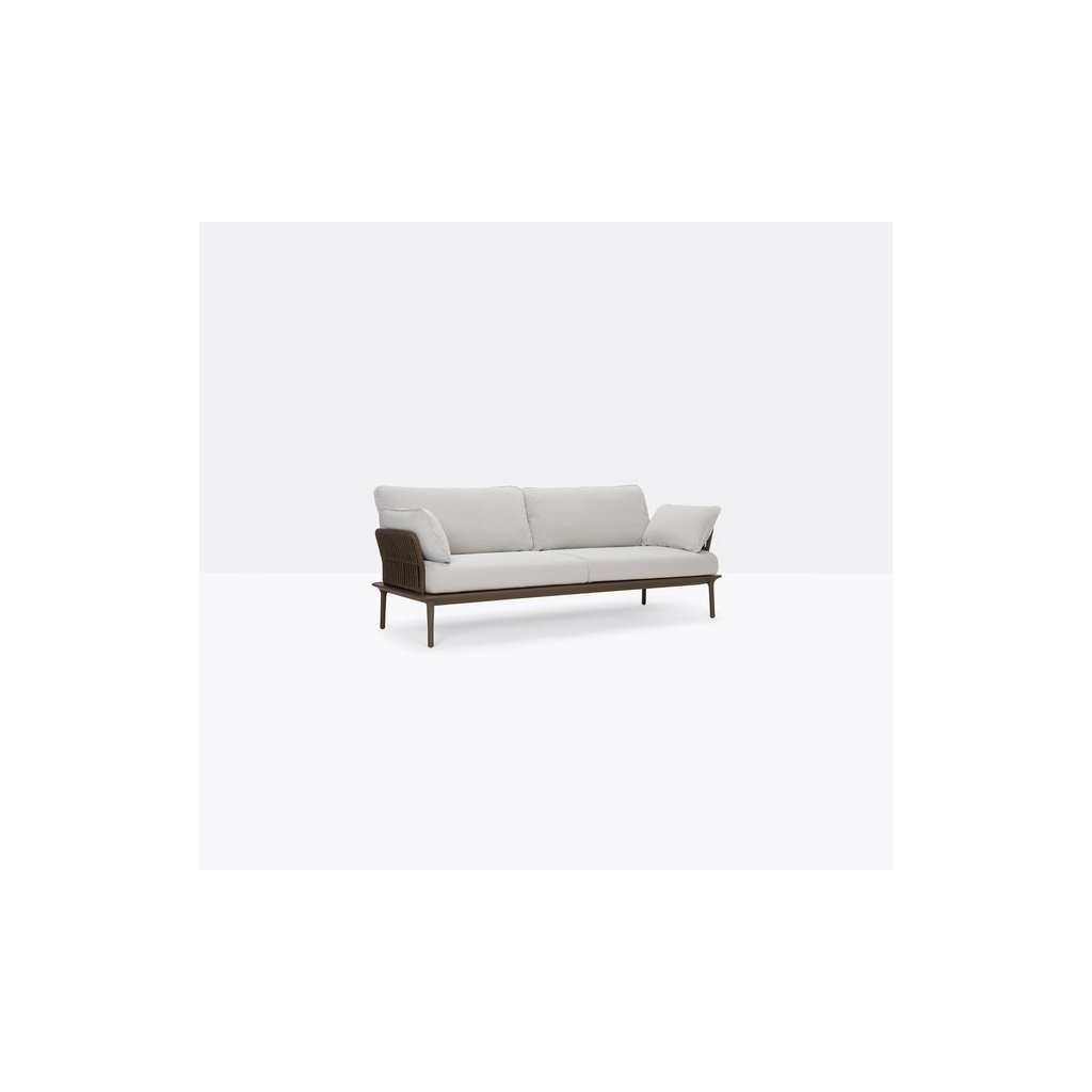 Exteriérová 3-miestna pohovka REVA/2_D so štyrmi zúženými nohami z hliníkového tlakového odliatku umiestnenými na okrajoch obvodového rámu z extrudovaného hliníka. Oceľový korpus (sedadlo a operadlo) a podrúčky sú tkané plochým lanom z plastu (polypropylénu) odolného voči poveternostným vplyvom.