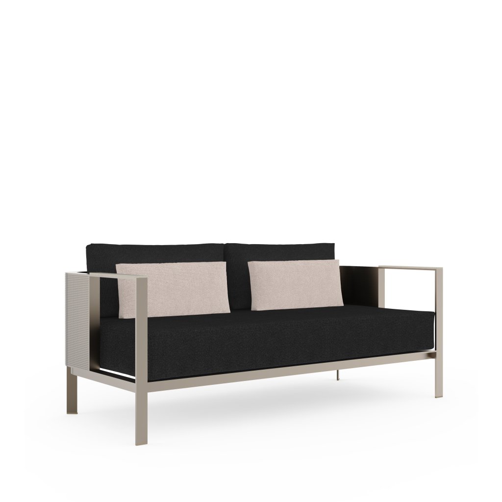 SOLANAS 2 seat sofa je dizajnová 2-miestna sedačka, v ktorej sa spája pohodlie objemných sedadiel a operadiel s hrejivosťou avantgardného dizajnu s jemnými zvlnenými líniami. Je vyrobená zo zváraných hliníkových profilov a mikroperforovaného hliníkového plechu. Jej lakťové opierky sú vyrobené z mimoriadne odolného materiálu Dekton® od firmy Cosentino, ktoré spočívajú na hliníkovom ráme s kvalitnou práškovou povrchovou úpravou v niekoľkých odtieňoch. Výplň matracov a vankúšov tvorí polyuretánová penová guma potiahnutá vodoodpudivou tkaninou. Sedačku SOLANAS 2 seat sofa si môžete prispôsobiť vďaka širokej škále farieb a špeciálnych tkanín vhodných na vonkajšie použitie. Skombinujte metalický zlatý odtieň s niektorou z našich tkanín a vytvorte si vlastnú kolekciu.